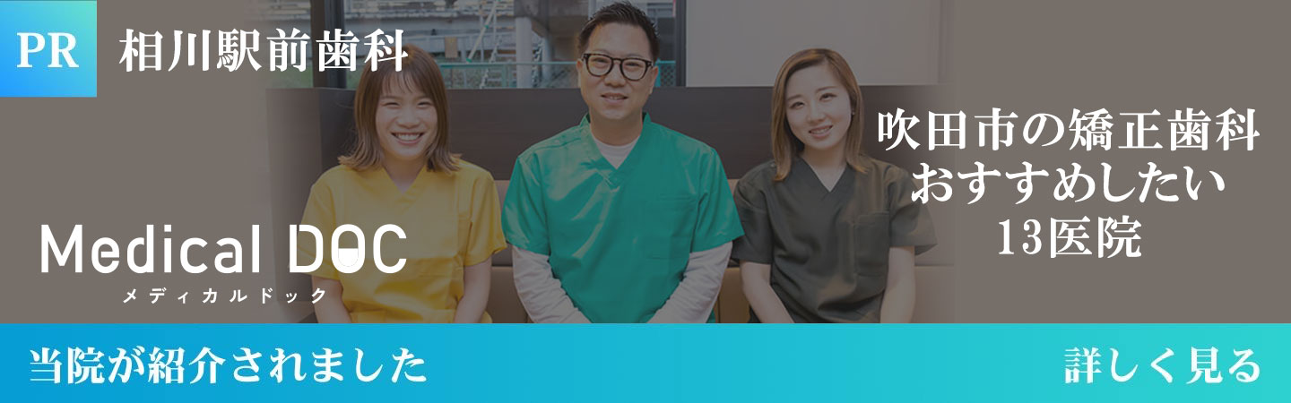 | 概要 | 阪急京都線「相川」駅東口よりすぐの【相川駅前歯科】です。一般歯科診療から矯正歯科やインプラント、難症例の親知らずの抜歯といった専門性の高い治療まで幅広く対応します。平日は夜19時まで、土曜日曜も17時まで診療しています。院内感染対策も徹底。 |